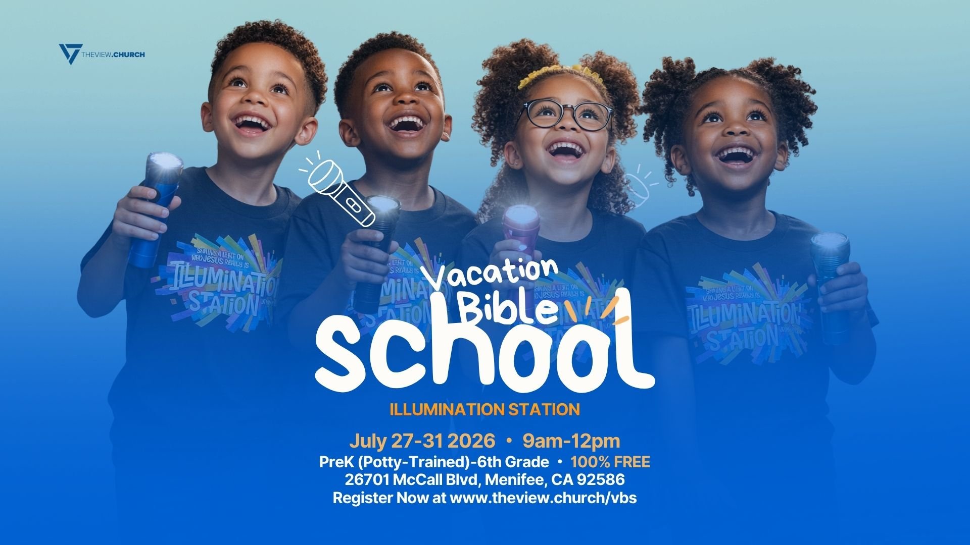 We are excited to kick off Vacation Bible School on-campus here at The View!! VBS integrates children, parents and the church in a fun environment complete with activities, games, and more that help students to encounter Christ. We are grateful to have this amazing week return to in-person activity this year, and we will be hosting students in Preschool (Potty Trained) - 6th grade, and registration is free of cost!